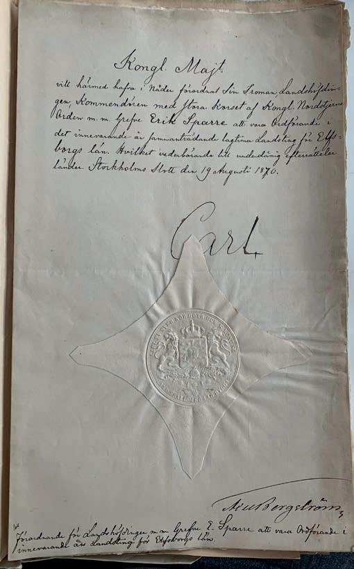 vill härmed hafva i nåder förordnat sin troman, Landshövdingen kommendören med stora korset av Kongl. Nordstierneorden m. m. Grefve Erik Sparre att vara ordförande i det innevarande år sammanträdande lagtima landsting för Elfsborgs län, hvilket vederbörande till underdånig efterrättelse länder, Stockholms slott den 19 augusti 1870. Carl [kungens namnteckning med kungl. sigill] /Axel Bergström