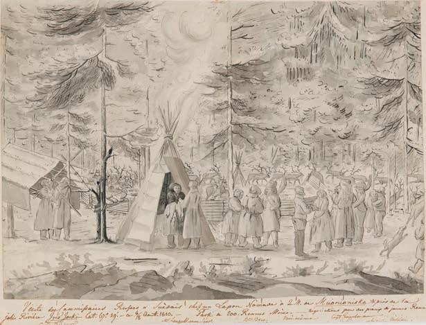 Den nya gränsen mellan Sverige och Ryssland efter förlusten av Finland 1809 drogs genom områden där befolkningen antingen talade finska eller samiska. Här ser vi en teckning av den svensk-ryska gränskommissions besök vid ett sameläger i Tornedalen i augusti 1810. Personerna i förgrunden är både samer och deltagare i gränskommissionen.