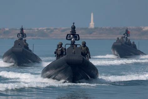 Medlemmar ur Taiwans marin navigerar specialoperationsbåtar under en militärövning nära Kaohsiung 2024. Taiwan genomför regelbundet sådana övningar för att visa sin beredskap att försvara sig mot militära hot från Folkrepubliken Kina, som gör anspråk på Taiwan.