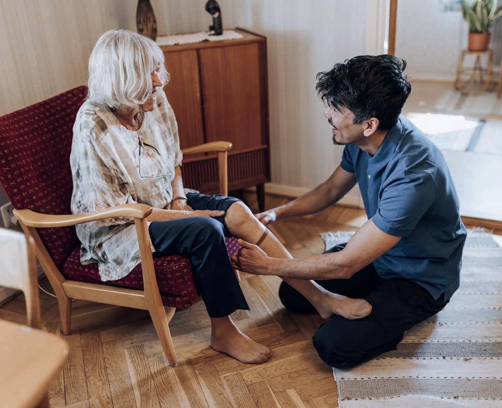 hand- och fotvården genom att fylla ett fotkar med ljummet vatten och ber Karin känna på vattnet. Hon säger att det känns bra.
