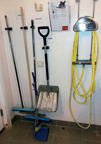 Arbetsredskap och spolslang för rengöring i en större djuranläggning. Skyfflar, borstar och andra redskap i djurstallar ska vara ergonomiskt utformade och i längd passa den som använder dem.