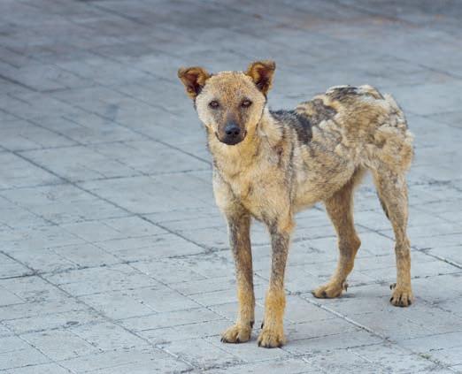 Gatuhund drabbad av ringorm. Symtomen syns som hårlösa fläckar på kroppen.