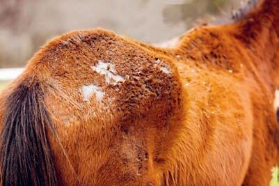 Ett exempel på ett av de många hudproblem som kan uppstå på hästar. Detta är regnskållor, Dermatophilus congolensis