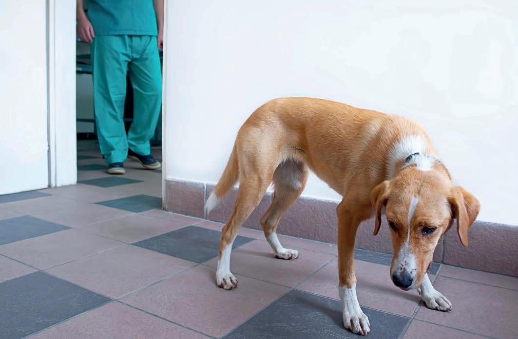 Bilden är från en veterinärklinik. Hunden visar tydliga tecken på att vara nervös och rädd. Här är det lämpligt att hundägaren hjälper till och agerar lugnande för sin hund.