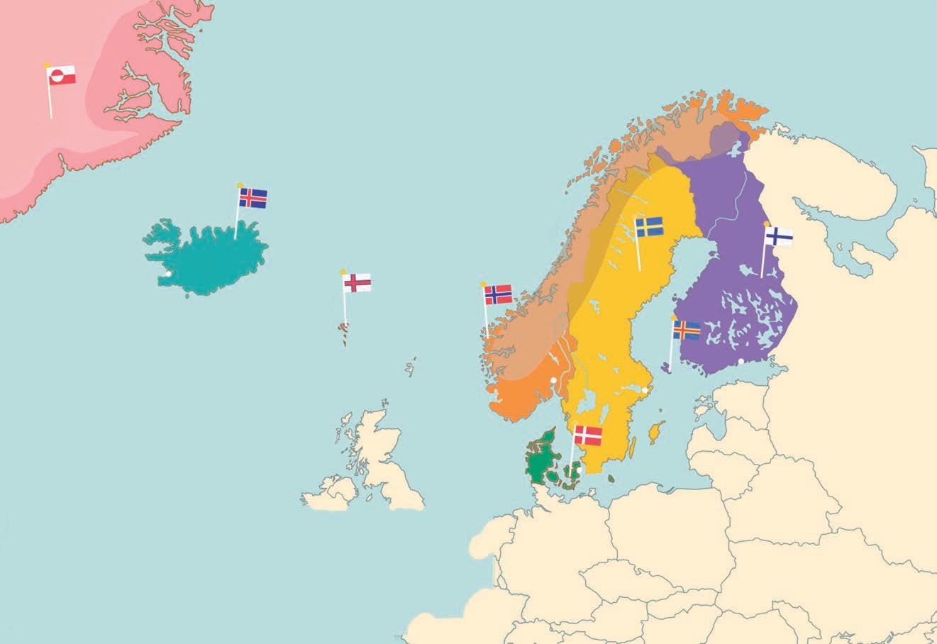 Skriv vilka Nordens länder, självstyrande områden och huvudstäder är. Skriv också vilka hav du ser på kartan som omger Norden. Ta hjälp av sidan 64 i grundboken och kartan på insidan av arbetsboken.