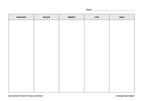 Kopieringsunderlag med fem olika rubriker som eleverna kan använda för att kategorisera ord och begrepp.