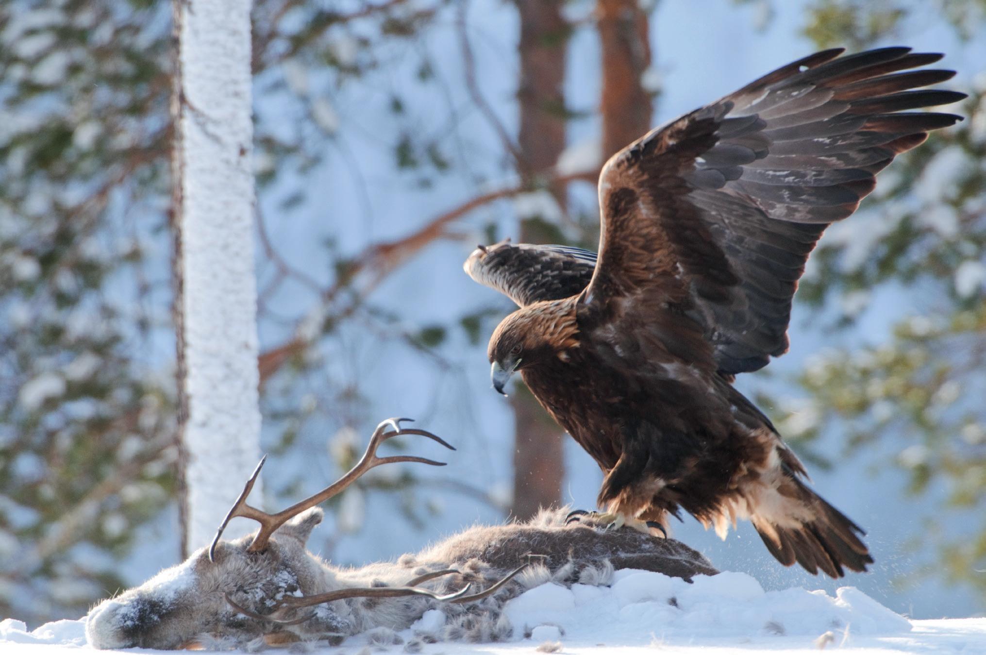 När ett djur dör i skogen blir det till mat åt andra djur. Här har en kungsörn hittat en självdöd ren.