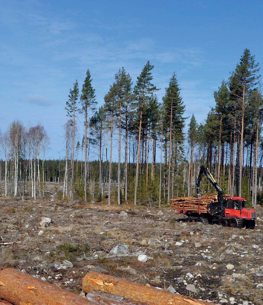Träden fälls, avverkas, i skogen. Stockarna skalas rena från grenar och staplas på hög för att transporteras till pappersbruken.