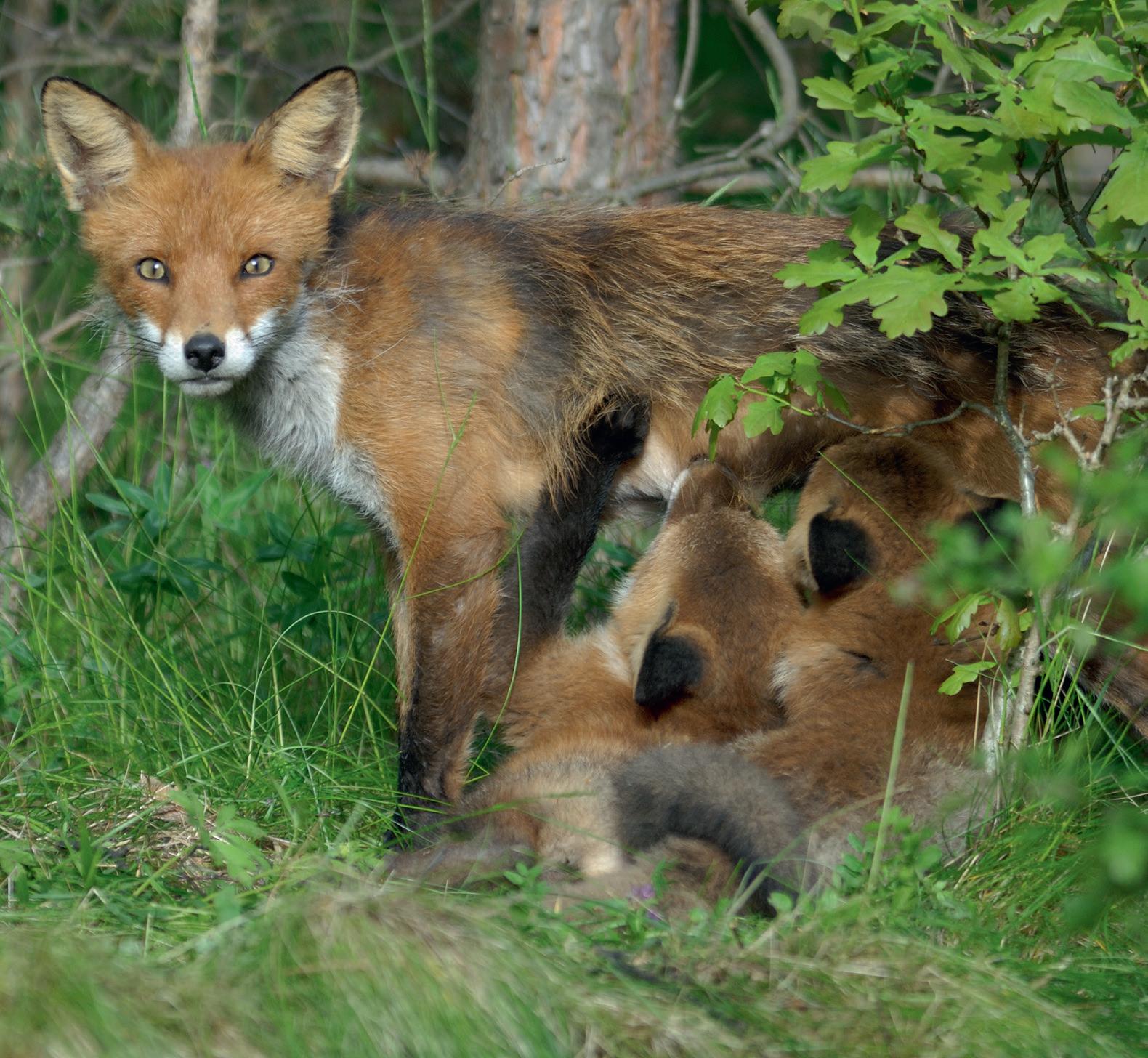 Skogen är en trygg plats för många djur. Träden ger vindskydd och det finns många bra ställen att bygga bon och gömma sig på. Det finns gott om mat för skogens olika djur. I trädens bark och på marken under grenar och stenar lever insekter. Bland träden finns småfåglar som äter insekter och frön, till exempel koltrast, bofink, talgoxe, blåmes, kungsfågel, lövsångare och rödhake. Det finns också rovfåglar och ugglor. De jagar sorkar, möss och mindre fåglar, precis som räven.