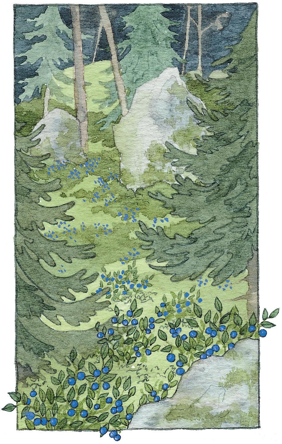 I skogen finns det många olika bär. Några av dem kan vi äta och använda till pajer, sylt eller saft. Blåbär trivs bäst i granskog, där marken är lite fuktig. De växer tätt och blåbärsriset bildar ofta en matta. Om skogen huggs ner, blir det så ljust och torrt på marken att blåbärsriset torkar bort. Man kan hitta blåbärsris året om, men på vintern är det svårare att känna igen. Då finns inga blad kvar, eftersom de vissnar och faller av på hösten.