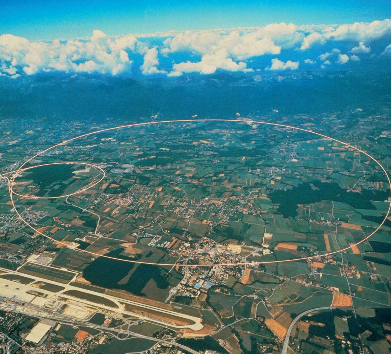 Vid forskningsstationen CERN i Schweiz studerar forskare de allra minsta partiklarna för att lära sig mer om universum och hur det bildades. För att försöka efterlikna hur det kan ha gått till skickas partiklar med extremt hög fart genom speciella tunnlar. På flygbilden är två cirkelformade tunnlar markerade. I verkligheten ligger de 100 meter under markytan. Den stora är 27 kilometer lång.