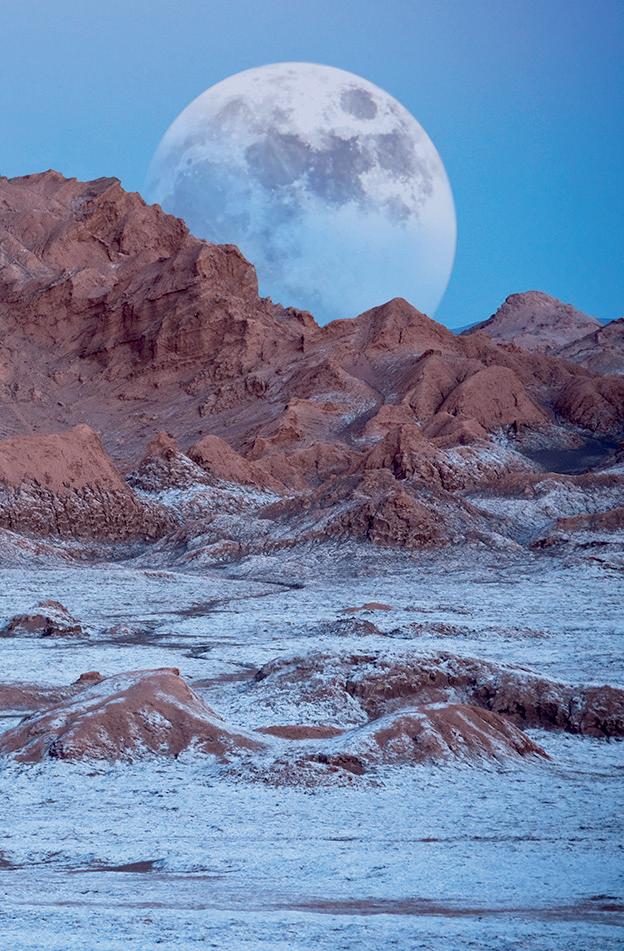Jorden sedd från månen, en ”jorduppgång”. Till skillnad från jorden har månen ingen skyddande atmosfär. Därför ändrar sig temperaturen mycket mellan natt och dag, från –150 °C till +100 °C.