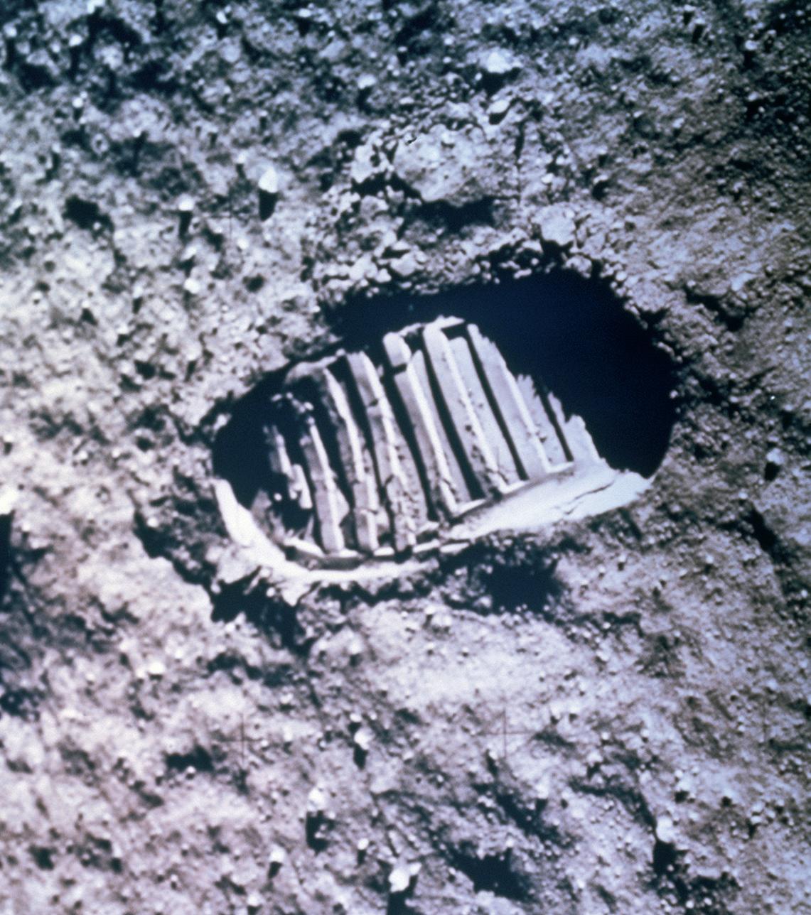 Det här är det första fotspåret av människan på månen. Det sattes när Apollo 11 landade där 1969.