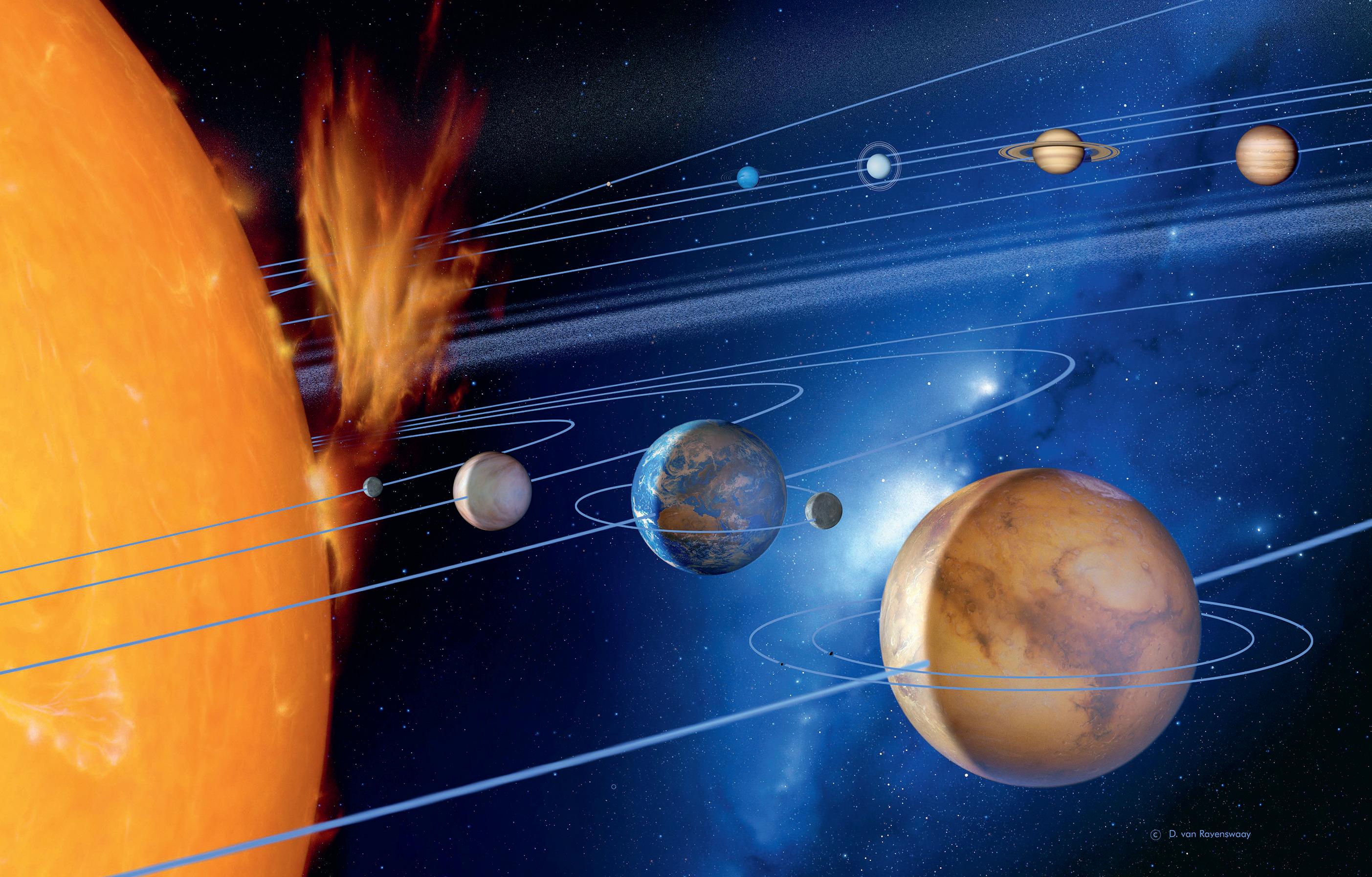 Bilden visar en modell av vår sol med alla planeter som kretsar runt den. Från solen kommer värme och ljus, men den slungar också ut laddade partiklar. Det kallas för solstormar, solvindar och soleruption.