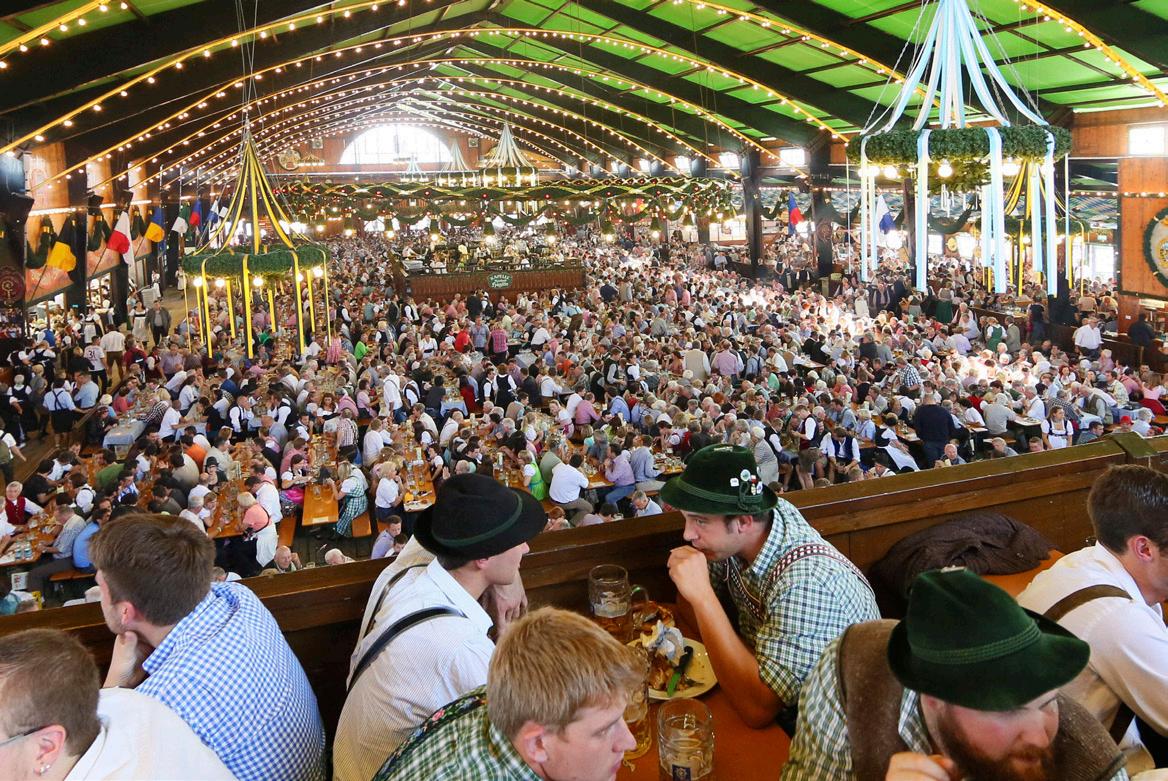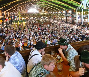 Mehr als 6 Millionen Besucher kommen jedes Jahr zum Oktoberfest, und sie reisen aus der ganzen Welt an. Viele kommen mit Lederhose oder Dirndl. Das ist bayerische Tradition. Es gibt viele Festzelte. Sie sind so groß, dass insgesamt 100 000 Besucher einen Sitzplatz finden. Man isst und trinkt im Zelt, und dazu spielt eine Kapelle Blasmusik. Die meisten trinken Bier, eine „Maß“. Das ist ein 1-Liter-Krug.