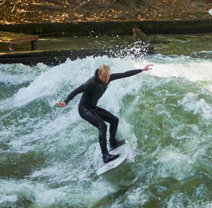 Die Familie wohnt nicht weit vom Englischen Garten. Das ist ein riesiger Park und sehr beliebt bei Münchnern und Touristen. Hier gibt es auch den Eisbach, ein Paradies für Surfer! Zur „großen Welle2“ kommen Surfer aus der ganzen Welt. Doch das ist etwas für Profis. Für Anfänger gibt es die „kleine Welle“. Da reitet auch Nicolo manchmal.