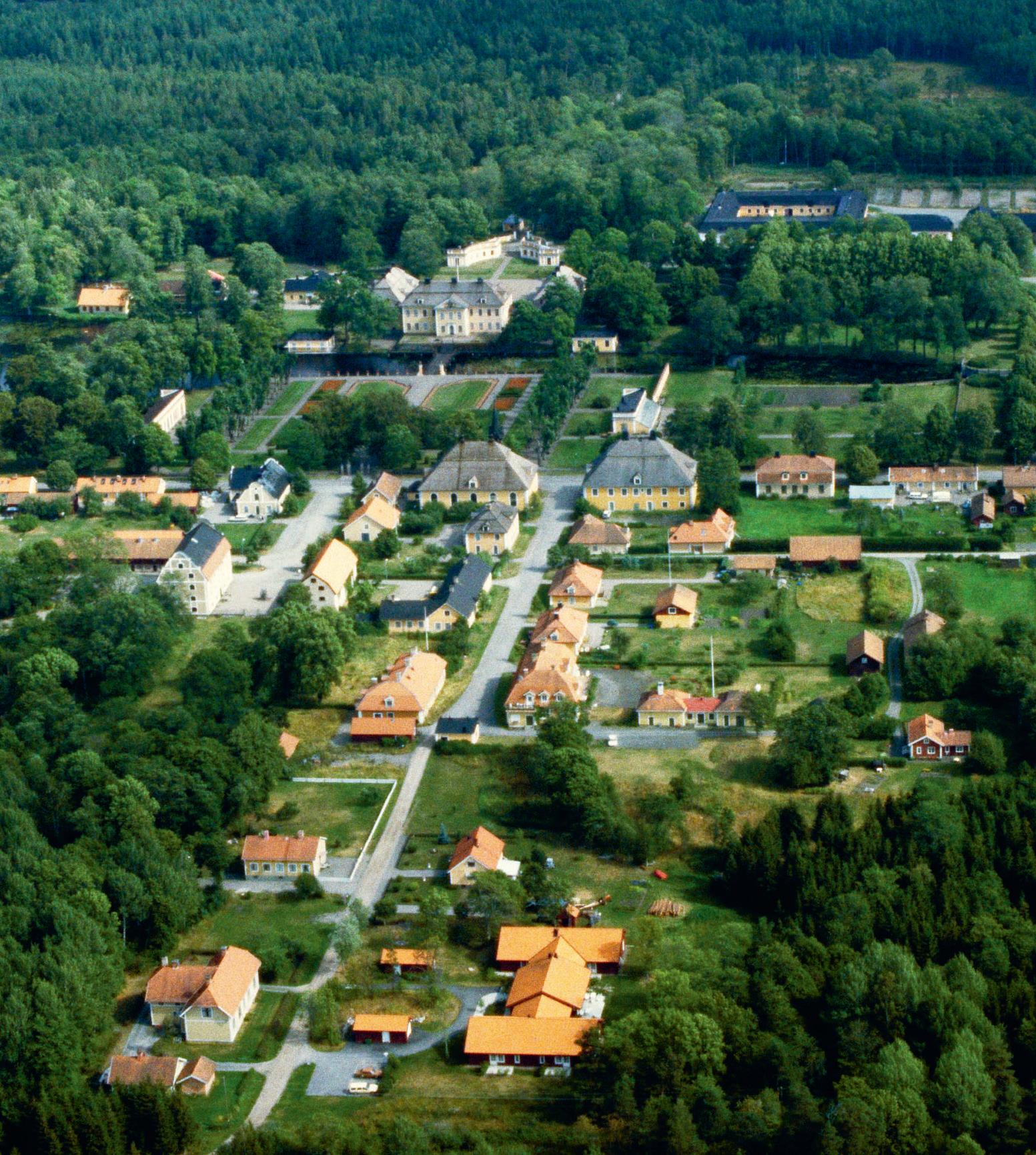Lövsta bruk i Uppland. Bebyggelse är typisk för bruksmiljön, där arbetarbostäder, kyrka och arbetsplatser tillsammans bildar en mindre stad. Fotograf: Jan Norrman 1995, Riksantikvarieämbetet.