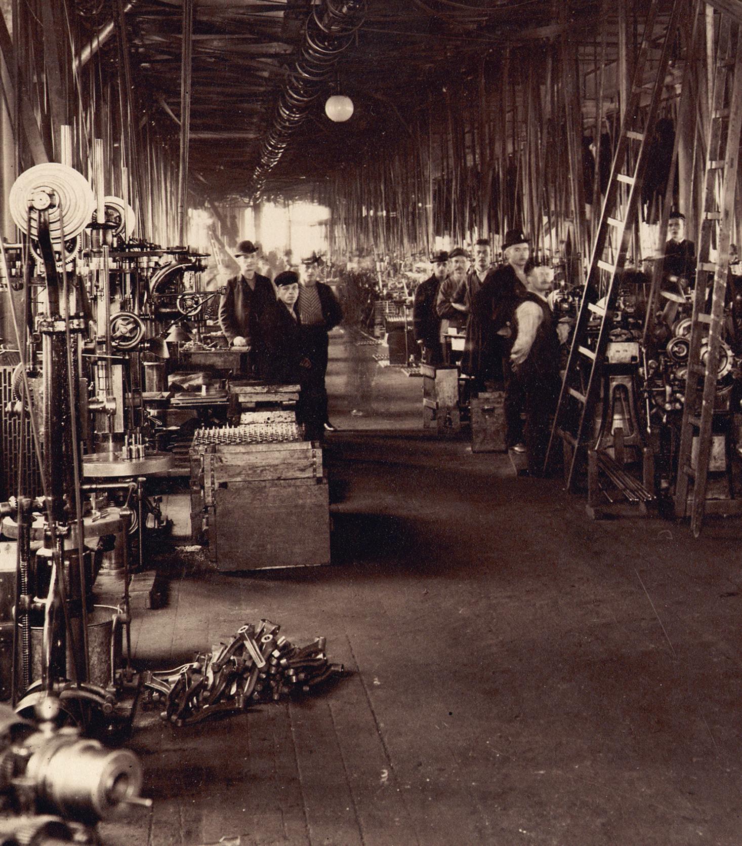 Övergången från hantverksmässig till industriell produktion innebar att behovet av arbetskraft i städerna ökade kraftigt. Här bild från Bolinders Mekaniska Verkstad i Stockholm (cirka 1910–1920).