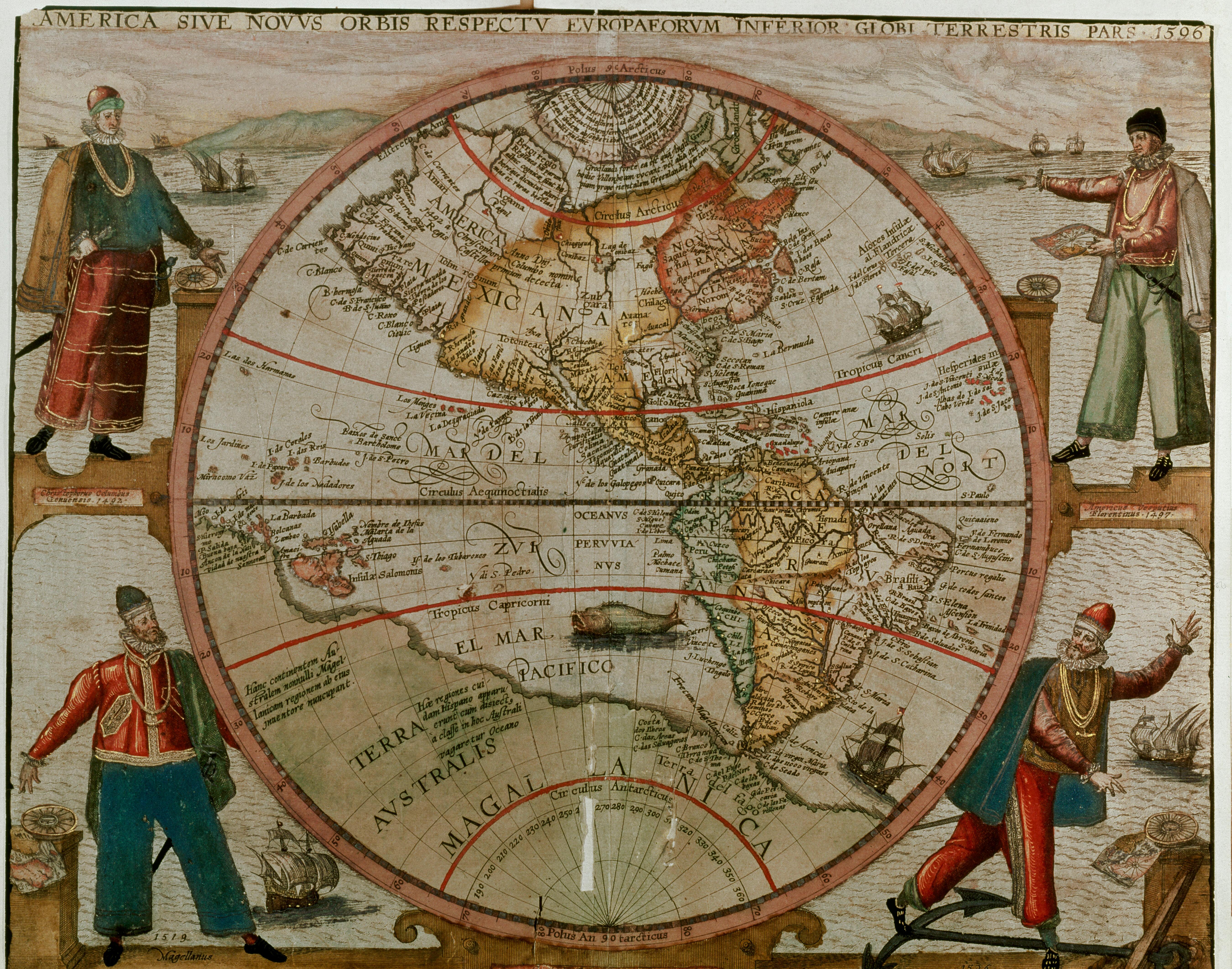Karta över Amerika med porträtt av Columbus, Vespucci, Magellan och Pizarro.