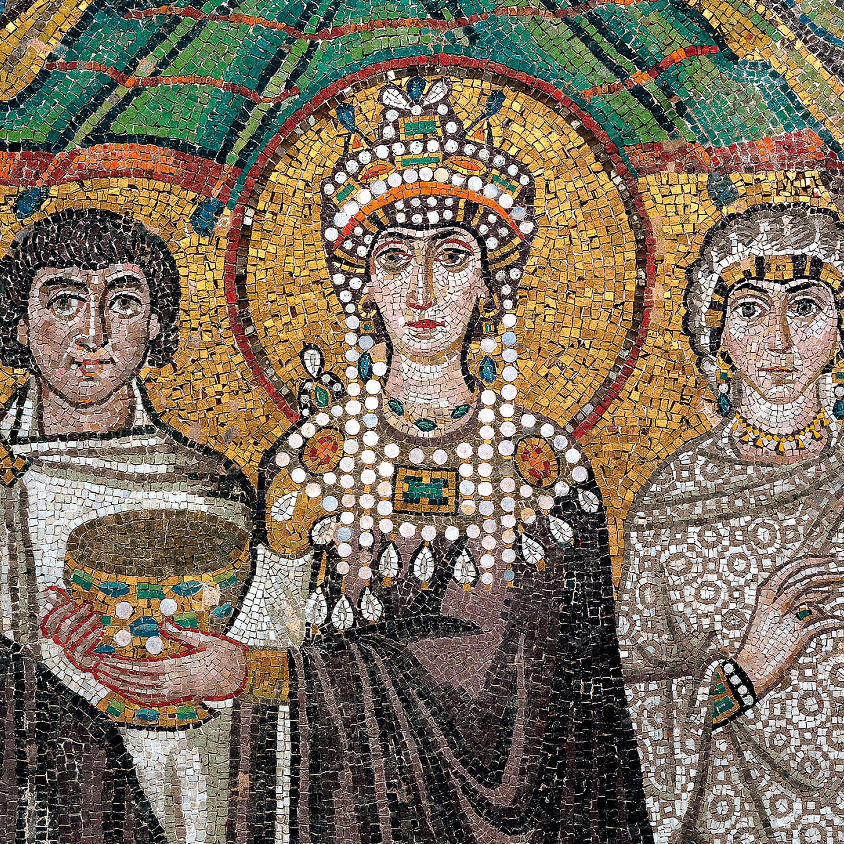 Kejsarparet Justinus och Teodora var nÄgra av de mÀktiga personer som pÄverkade kristendomens utveckling. Mosaik frÄn basilikan San Vitale i Ravenna, Italien.