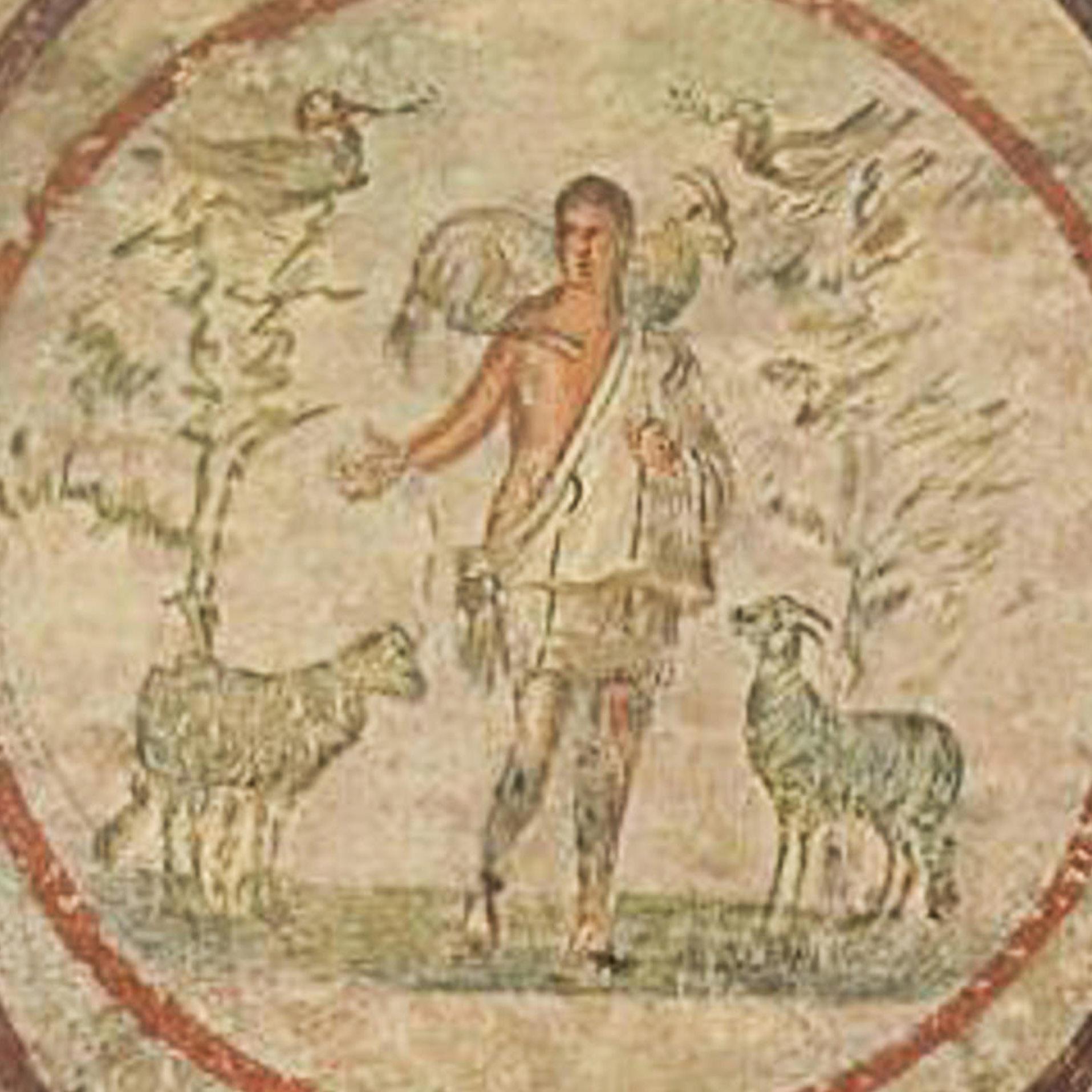 Jesus Ă€r den person kring vilken kristendomen utvecklades. HĂ€r mĂ„lad som âden gode herdenâ pĂ„ en vĂ€gg i katakomberna i Rom, pĂ„ 200-talet.