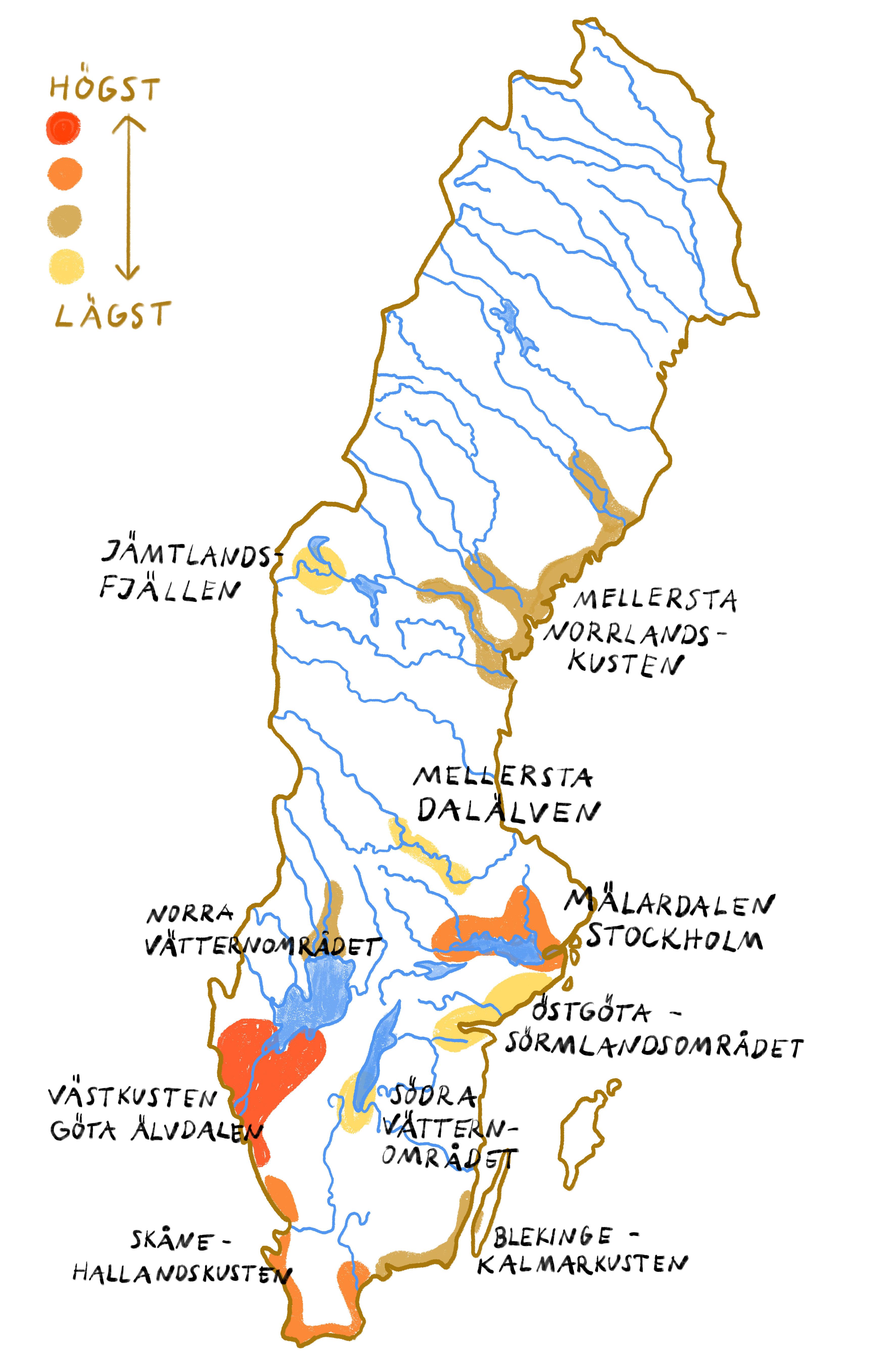 ⹠Kartan hÀr bredvid visar klimatrelaterade riskomrÄden i Sverige. Ta reda pÄ vilka risker det rör sig om.