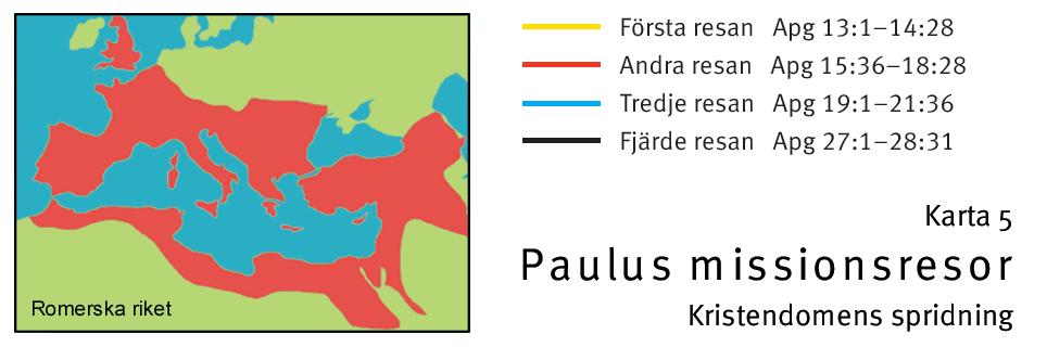 Som hedningarnas apostel gjorde Paulus tillsammans med olika medhjälpare tre missionsresor i östra Medelhavsområdet, se Karta 5. Eventuellt har han också besökt Spanien. Han grundade en rad kristna församlingar i Mindre Asien och Grekland och tillsatte ledare för dessa. Efter flera år i fångenskap – med perioder av frihet – led Paulus martyrdöden. Han blev troligen halshuggen under kejsar Neros förföljelse på 60-talet e.Kr.