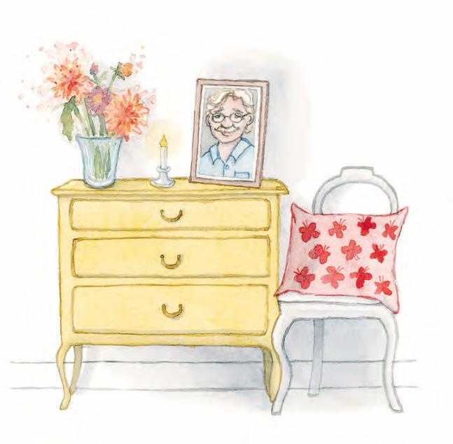 På byrån finns ett foto av morfar. Han har på sig den blåa skjortan som han fick när han fyllde år. Han ser glad ut. Bredvid står ett tänt ljus i en silvrig ljusstake.