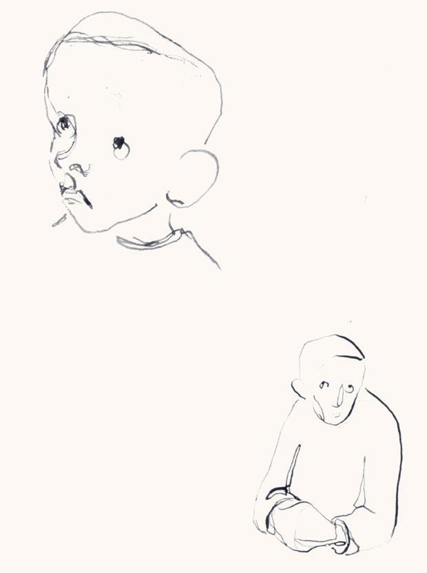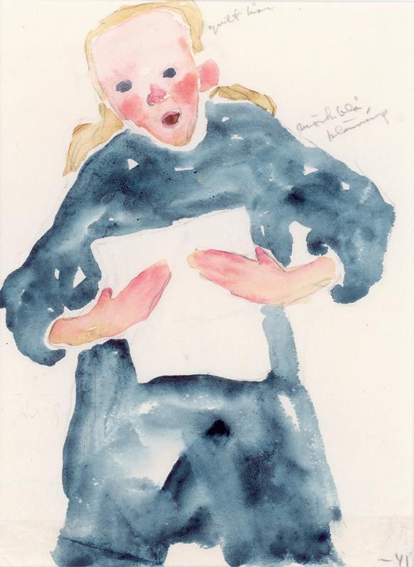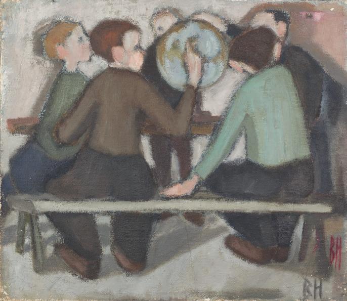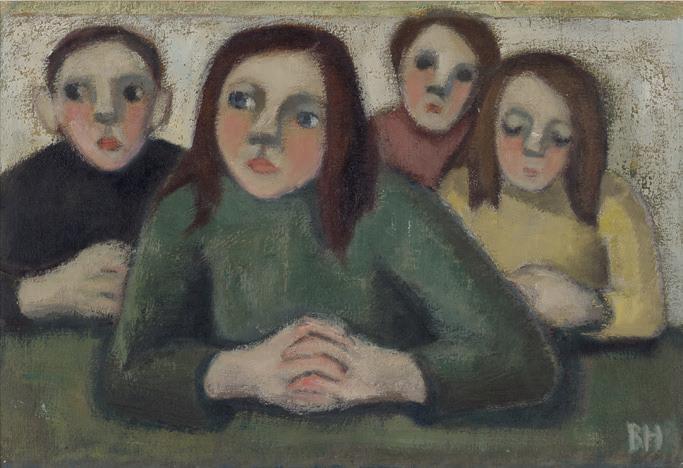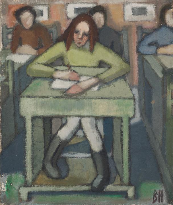 Jag följde med uppför en skranglig trappa, kom in i ett stort trevligt rum ovanför skolsalen – och blev stående framför en tavla som grep mig; allvarsamma barnansikten utan all fadd sötma, sparsam färgskala i fina toner. Jag kom att tänka på Helene Schjerfbeck.