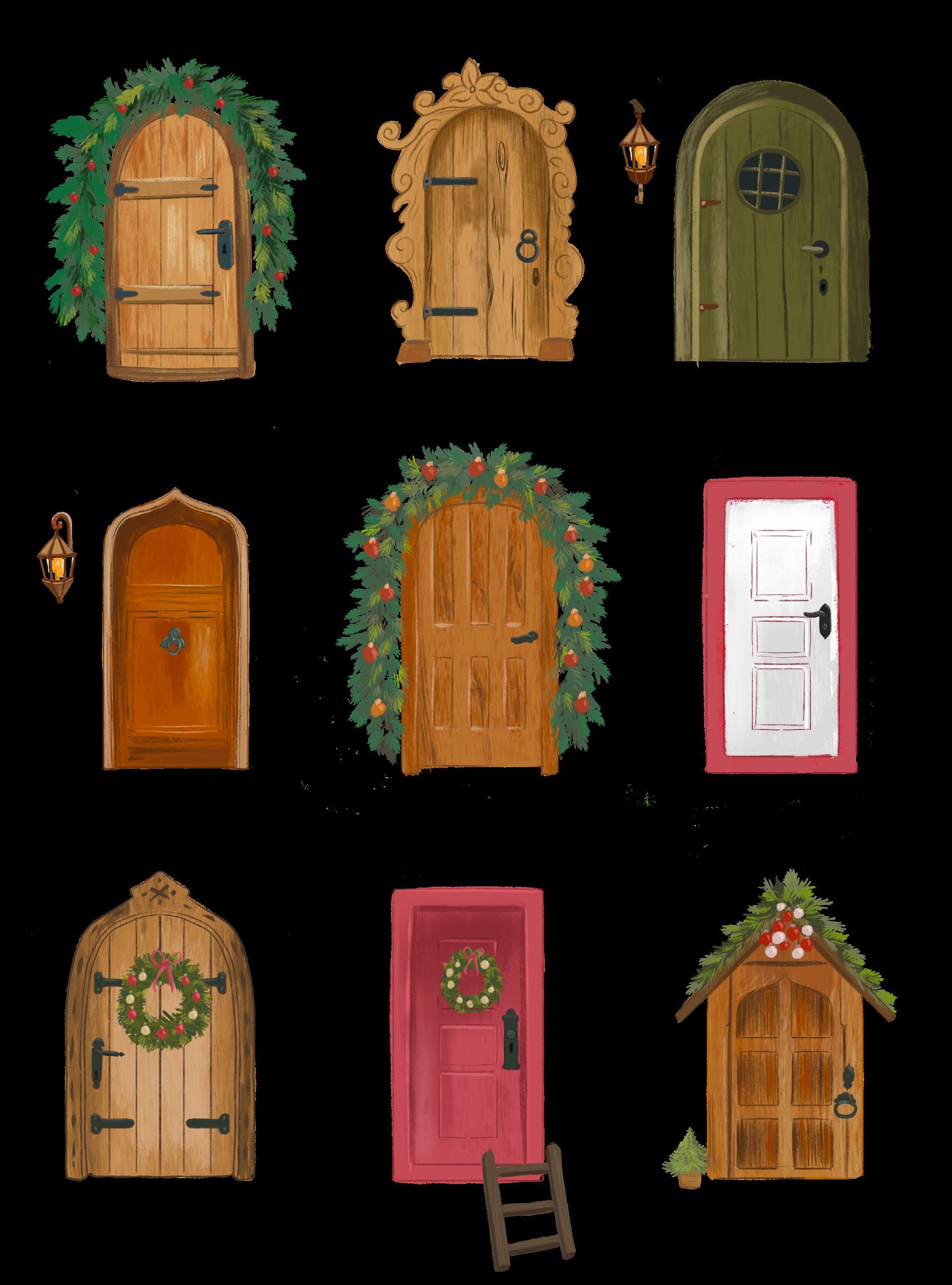 Dörren är ofta gjord av trä, men fnns också i andra material som kartong eller sten. Färgerna varierar, även om de allra festa är röda, träfärgade, bruna eller gröna. De kan vara fyrkantiga, spetsiga, lite rundade eller ha en mer udda form. Här bredvid ser du några olika exempel på nissedörrar.