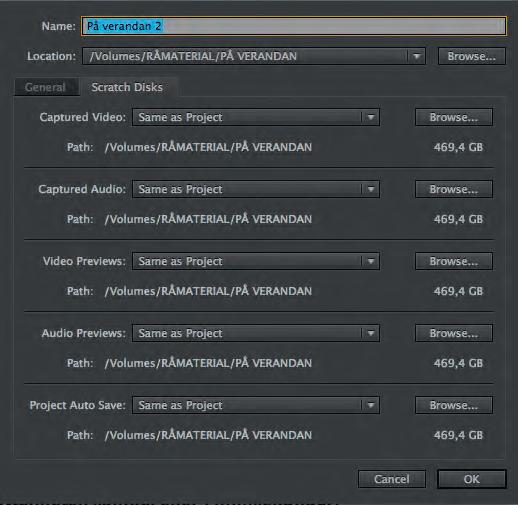 Under nästa fli, Scratch Disks, väljer du var olika sorters material ska läggas. Det kan dels vara filer som sapas av själva programmet under arbetets gång och dels material som du själv importerar till projektet. Med standardinställningen (Same as Project) läggs materialet på samma plats som angetts för projektfilen