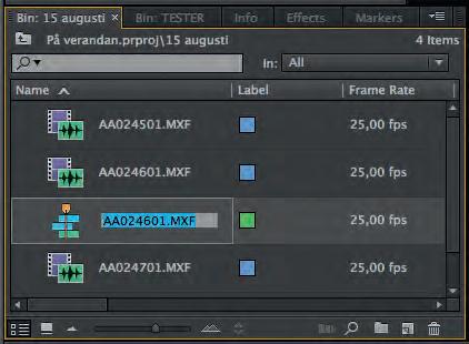 3. Tidslinjen f år klippets namn. Du gör klokt i att ge den ett annat namn och kanske placera den i en egen mapp där du samlar alla dina sekvenser. För att ändra namn på en tidslinje gör du på samma sätt som med ett klipp. Markera namnet på sekvensen i projektfönstret och när texten blir blå kan du skriva in ett nytt namn.
