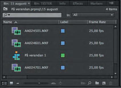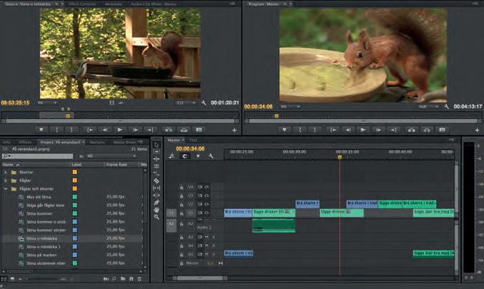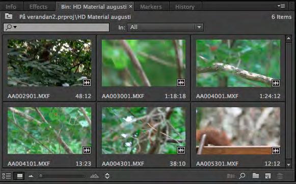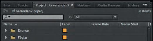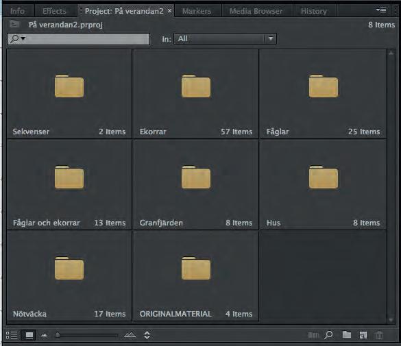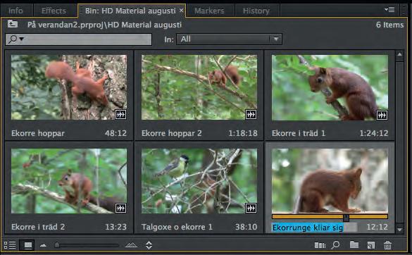 Här ha r filmklippen lagts i olika undermappar som: Ekorrar, Fåglar, Ekorrar och Fåglar. Även sekvenser har fått en egen mapp. Med sekvenser menas här tidslinjer (Sequences).