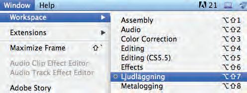 • Det finns örinställda layouter för olika arbetsmoment som till exempel färgkorrigering. Då väljer du Window, Workspace, Color Correction. Standardinställningen kallas Editing.