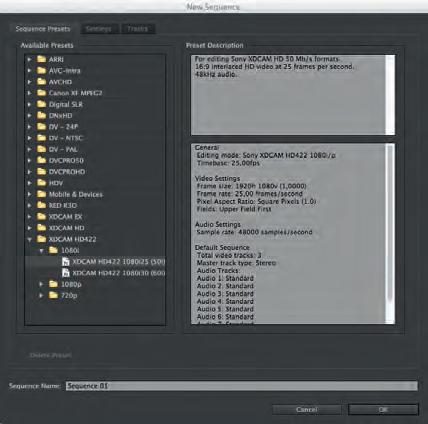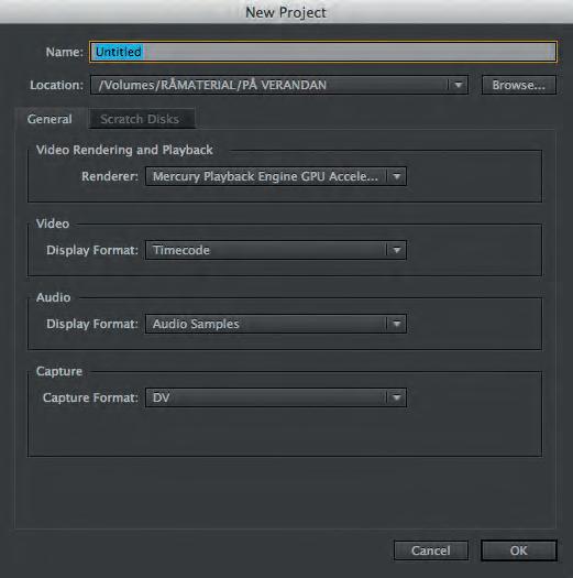 När du skapar ett projekt för första gången kommer du att efter New Projectfönstret få upp ett fönster som heter New Sequence. Här kan du göra inställningar för tidslinjen. Det finns mängder v valmöjligheter, men det är inte nödvändigt att göra några inställningar här. Om du är osäker på vilka inställningar som är de rätta för just ditt projekt klickar du på Cancel. Då kommer du rakt in i programmet och när du väl har hämtat in klippmaterial till ditt nya projekt kan du lätt skapa en Sequence (sekvens eller tidslinje) med rätt inställningar. Med rätt inställning menas dels att tidslinjen passar för den kodek som ditt material är inspelat i, dels att bildhastigheten (kanske 25 bilder per sekund) och bildupplösningen (till exempel 1920 x 1080) stämmer överens med originalmaterialet.
