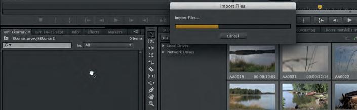 Om du har material som ligger på ett minneskort måste du först kopiera in det på din dator eller på en extern hårddisk. Premiere Pro kan läsa originalfilena. Du behöver alltså inte konvertera dem till ett annat format som du måste göra i flea andra redigeringsprogram. Visserligen kan Premiere läsa filena direkt från minneskortet, men programmet kopierar inte in några filer uan refererar endast till råmaterialet. Skulle du arbeta direkt från ett minneskort, kommer klippen att saknas i projektet så fort minneskortet inte är inkopplat. Därför måste du samla allt det material du arbetar med på datorn eller på en extern hårddisk.