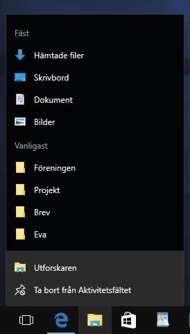 Många av knapparna i aktivitetsfältet innehåller så kallade snabblistor. Med hjälp av dessa kan du starta programmet och direkt öppna ett objekt som du nyligen har använt, eller som du använder ofta. På samma sätt som du kan fästa program i aktivitetsfältet kan du fästa objekt i snabblistorna.