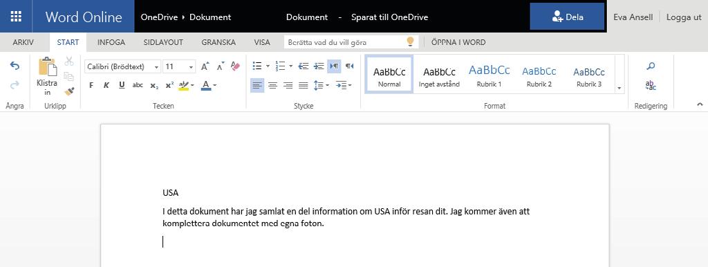 När du skapar ett nytt tomt dokument i Word Online visas det i redigeringsvyn och du ser bara en tom vit yta som är ditt dokument. Det svarta blinkande strecket, insättningspunkten, styr var den text som du skriver hamnar. Dokumentet sparas automatiskt under tiden du arbetar med det.