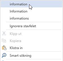 När du skriver text kommer den automatiska stavningskontrollen att kontrollera om orden är rättstavade. De ord som inte finns i ordlistan, visas med en röd vågig understrykning. Om du högerklickar på ett markerat ord visas en meny där du får förslag på hur ordet kan stavas. Välj önskat ord för att ersätta det felstavade ordet.