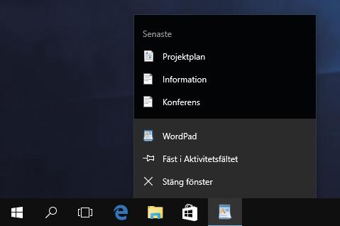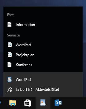 Vad som visas i listan beror på vilket program den är kopplad till . I Utforskaren visas ofta använda mappar, i Outlook visas vanliga aktiviteter och i WordPad visas de senaste dokumenten .