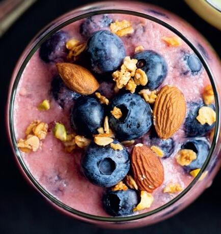 Smoothie: 1 dl vaniljyoghurt 3 %, ¾ dl kvarg 10 %, ½ banan, 1 dl frysta bär och 1 tsk olja