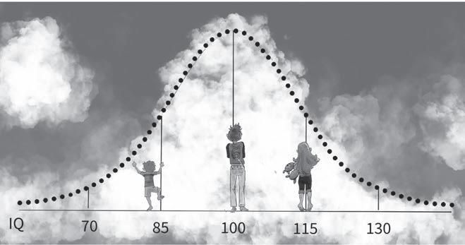 Teoretisk begåvning/intelligens är normalfördelad, vilket bilden nedan illustrerar. Det innebär att majoriteten, drygt 68 procent av befolkningen, ligger genomsnittligt, det vill säga mellan IQ 85–115, ungefär 14 procent ligger klart under genomsnittet, en lika stor andel ligger klart över genomsnittet medan runt 2 procent ligger betydligt under genomsnittet, vilket betyder under IQ 70, och samma andel ligger betydligt över genomsnittet, vilket betyder IQ över 130.