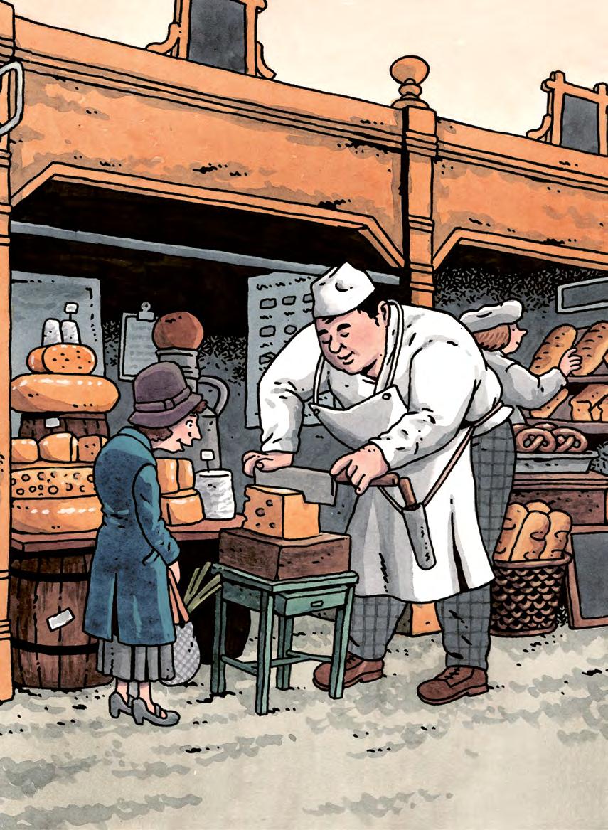 Ostgubben satte precis kniven i en schweizerost och skar loss ett stycke lika stort som en herrsko. Kvinnan som skulle köpa biten stod bredvid och såg på osten med hungriga ögon.