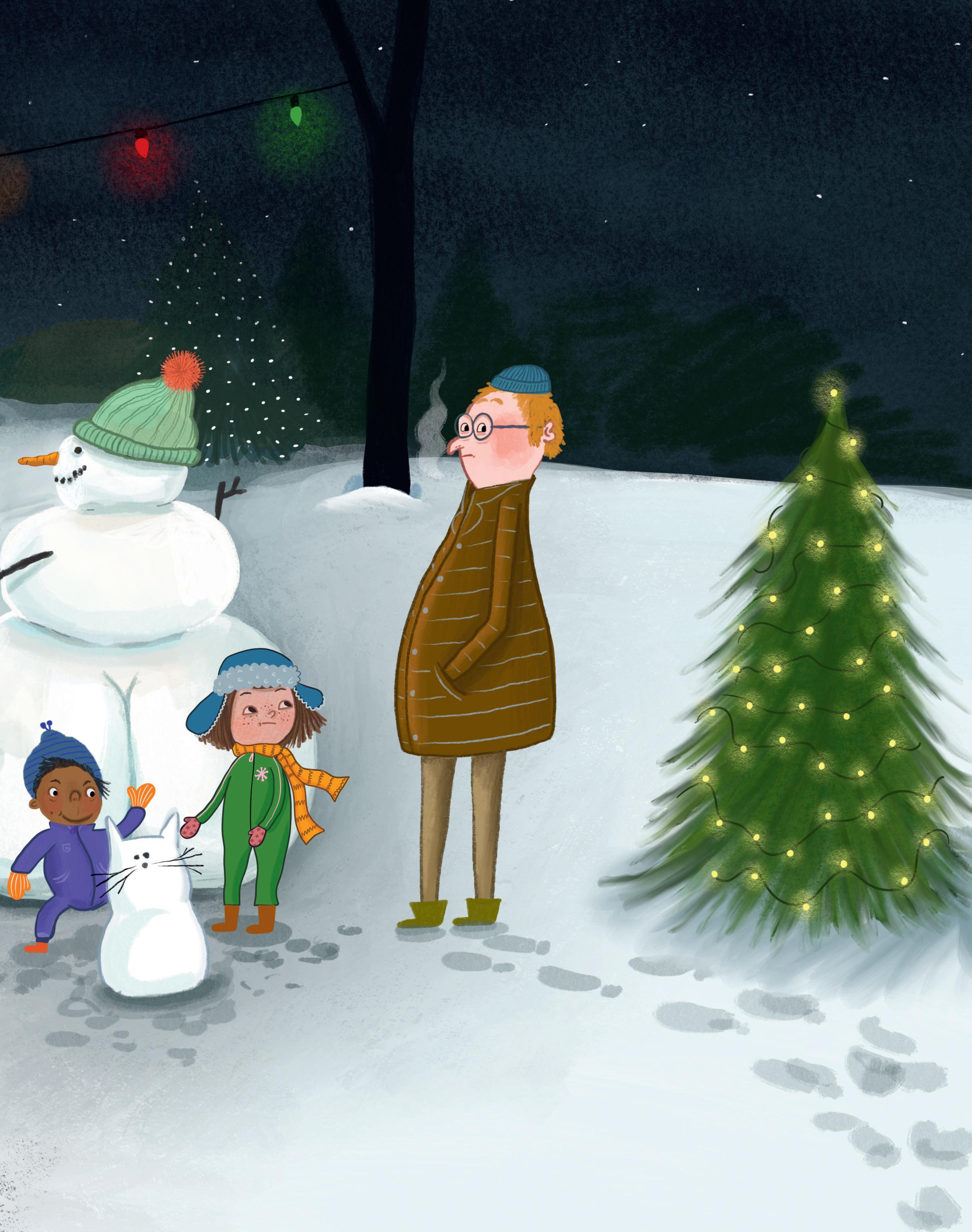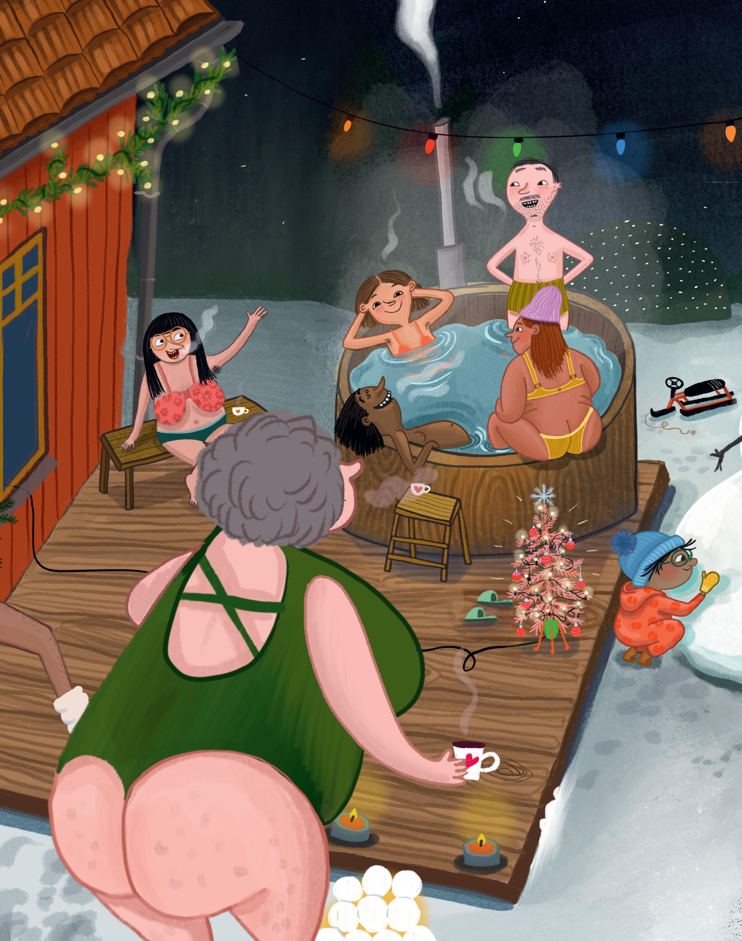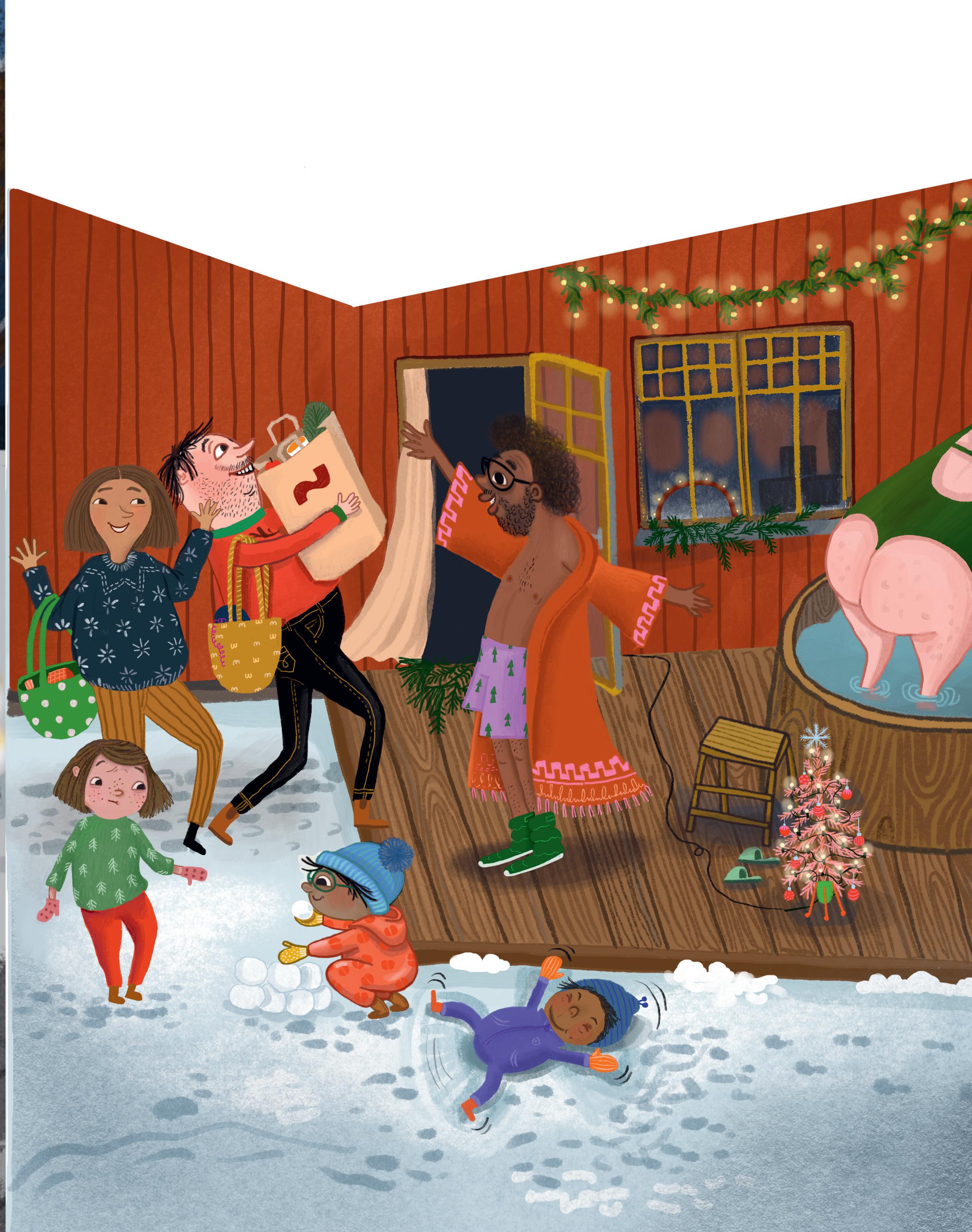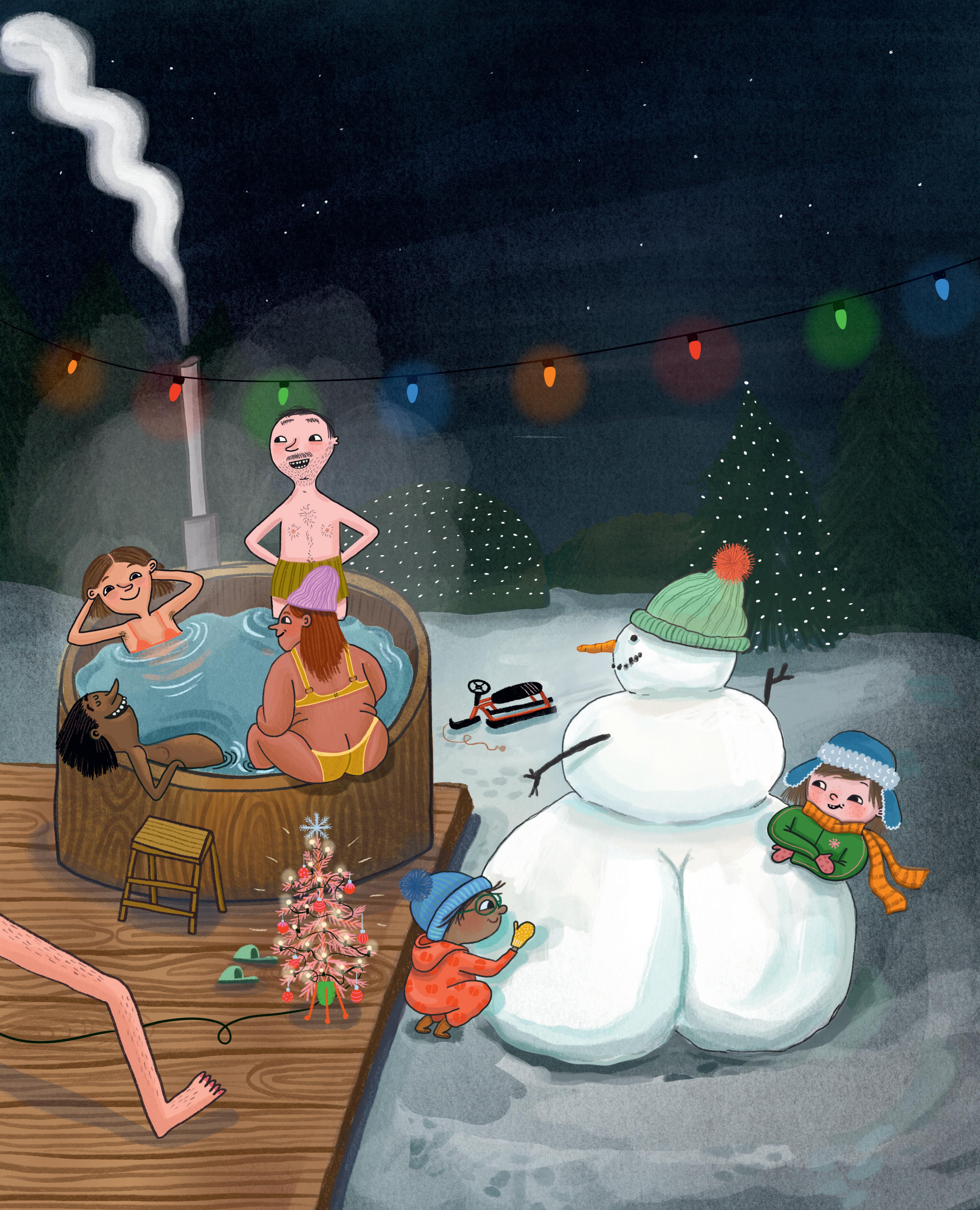 Alla vuxna vill bada i den varma badtunnan. Men barnen vill hellre leka i snön. Det är kul att göra snögubbar och de kan se ut precis hur som helst.