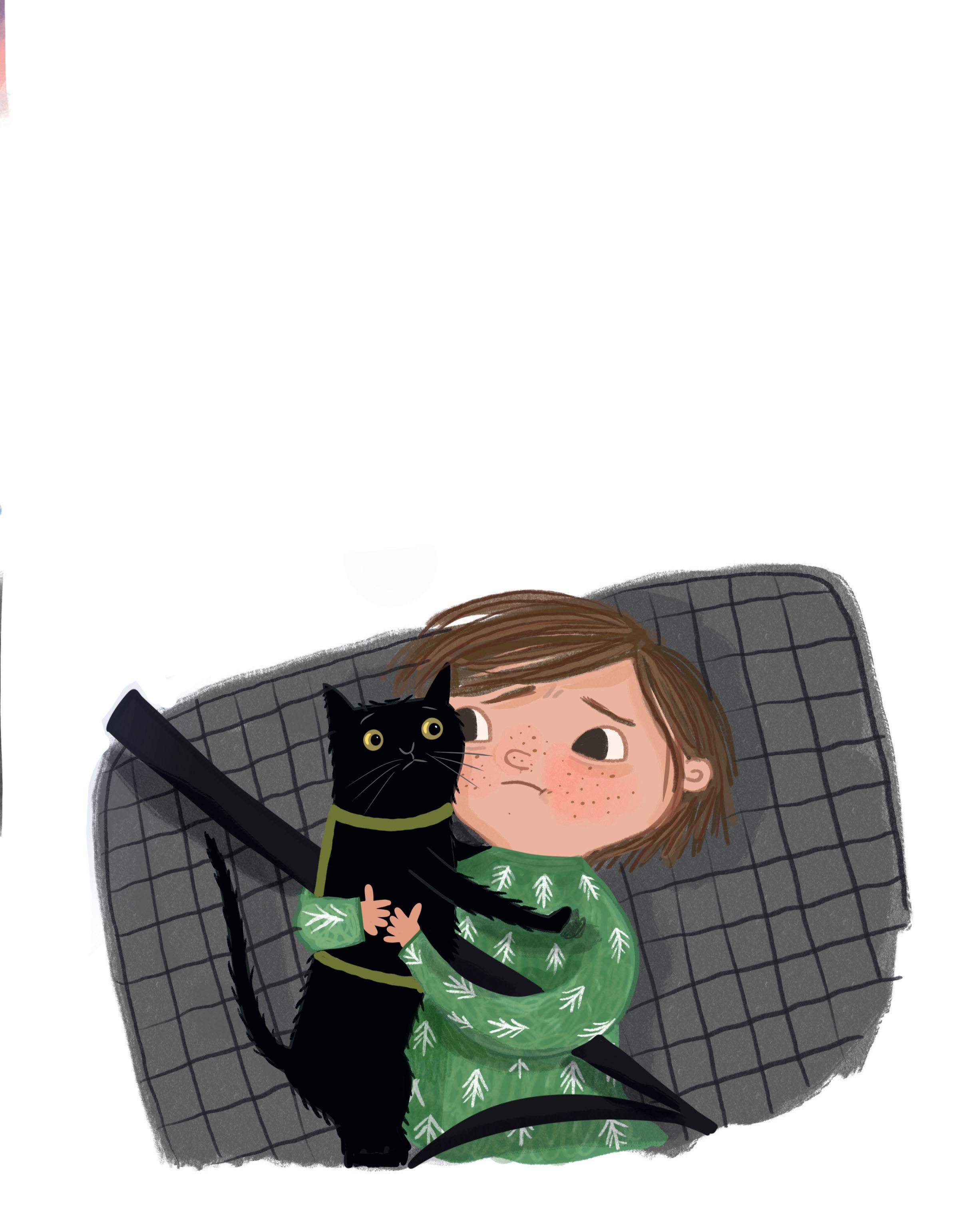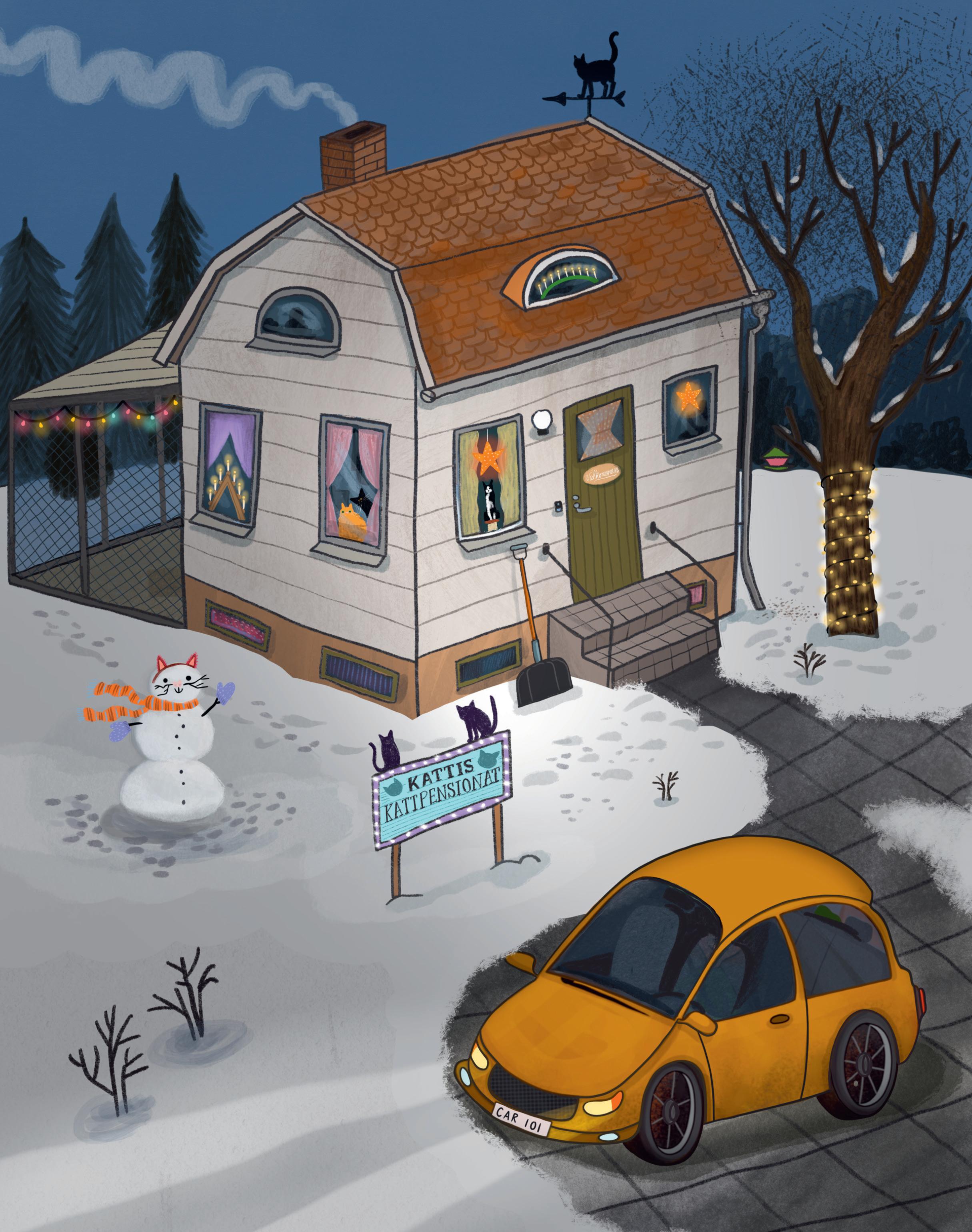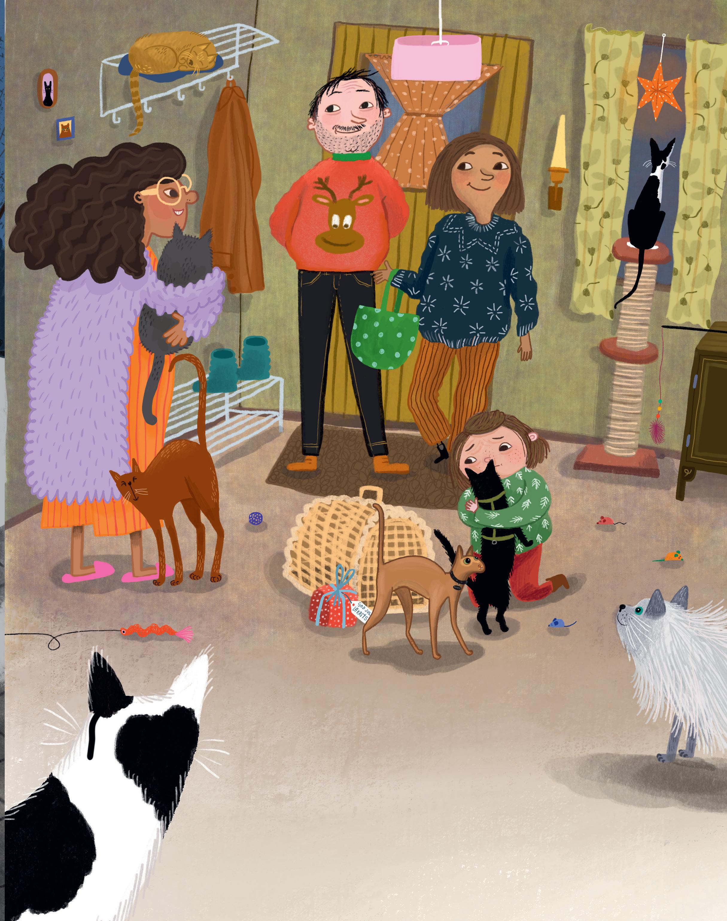 ”Eh, jo, Mira”, säger pappa plötsligt. ”Kommer du ihåg min farbror Bertil? Han är jätteallergisk mot katter. Och eftersom han ska vara med på julafton, så kan inte Lakrits följa med. Han får bo på ett jättefint kattpensionat under tiden.”