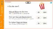 Efter genomgången arbetar eleverna i sina böcker. Där får de möjlighet att öva på språkets grammatiska struktur och begrepp i tre olika övningar. I den fjärde och sista övningen på uppslaget, ritar och/eller skriver eleverna mer fritt.