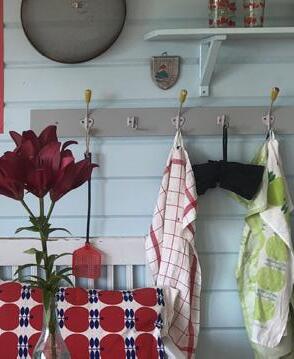 DÄ Àr tonen satt . Jag tittar alltid efter mönster och har köpt mÄnga tapetrullar genom Ären En av de tidigare var pÄ en loppis i New York, dÀr fanns det en kartong med typiska amerikanska köksmotiv frÄn 1940-talet. Jag kunde bara fÄ med mig en rulle, men den rÀckte nÄgra Är senare perfekt till vÄr ena köksvÀgg . Den förestÀller krukor pÄ hyllor och gÄr i rött och grönt pÄ ljus rosa, beige och grÄ bakgrund . En tapetrest blev ocksÄ ett bokomslag till en roman som utspelade sig i USA pÄ 1940- och 50-talen. Mönstret sammanfattade boken sÄ bra.