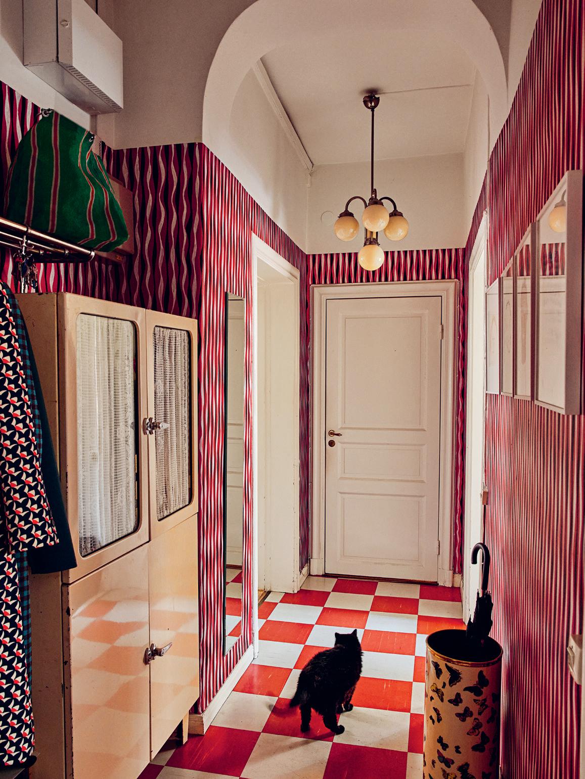 FrÄn min plats kan jag se in i hallen . DÀr Àr halltapeten som jag blev tvungen att mÄla klart sjÀlv, för tapeten rÀckte inte till hela rummet. Mönstret (svarta och vita vÄgiga stÄende rÀnder pÄ karamellröd bakgrund) fick mig att tÀnka pÄ hur ett kafé i GrÀnna kunnat se ut nÀr min mamma gick dÀr pÄ 1950-talet eller en biograffoajé frÄn samma tid, det kunde ju bli fint i en hall? Tapeten rÀckte bara till en tredjedel av hallen, men efter femton Är hade jag mÄlat klart vÀggarna för hand. I taket hÀnger lampor i art déco-stil. Det gör mig inget om stilar blandas, det tillför oftast nÄgot. Nu vill jag sy en dyna till en bÀnk som stÄr dÀr . DÄ och dÄ bÀr jag dit en bit mönstrat tyg och ser om det passar, men annat kommer emellan och först mÄste jag skaffa sjÀlva dynan.