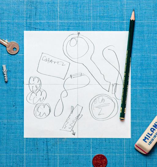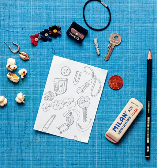 1. Jag tÀnkte att mönstret skulle bestÄ av smÄsaker som fanns lÀngst ner i min vÀska. Jag skissade lite för att se hur jag kunde rita de olika föremÄlen. Det hÀr kommer att bli bestÄndsdelarna i rapporten.
