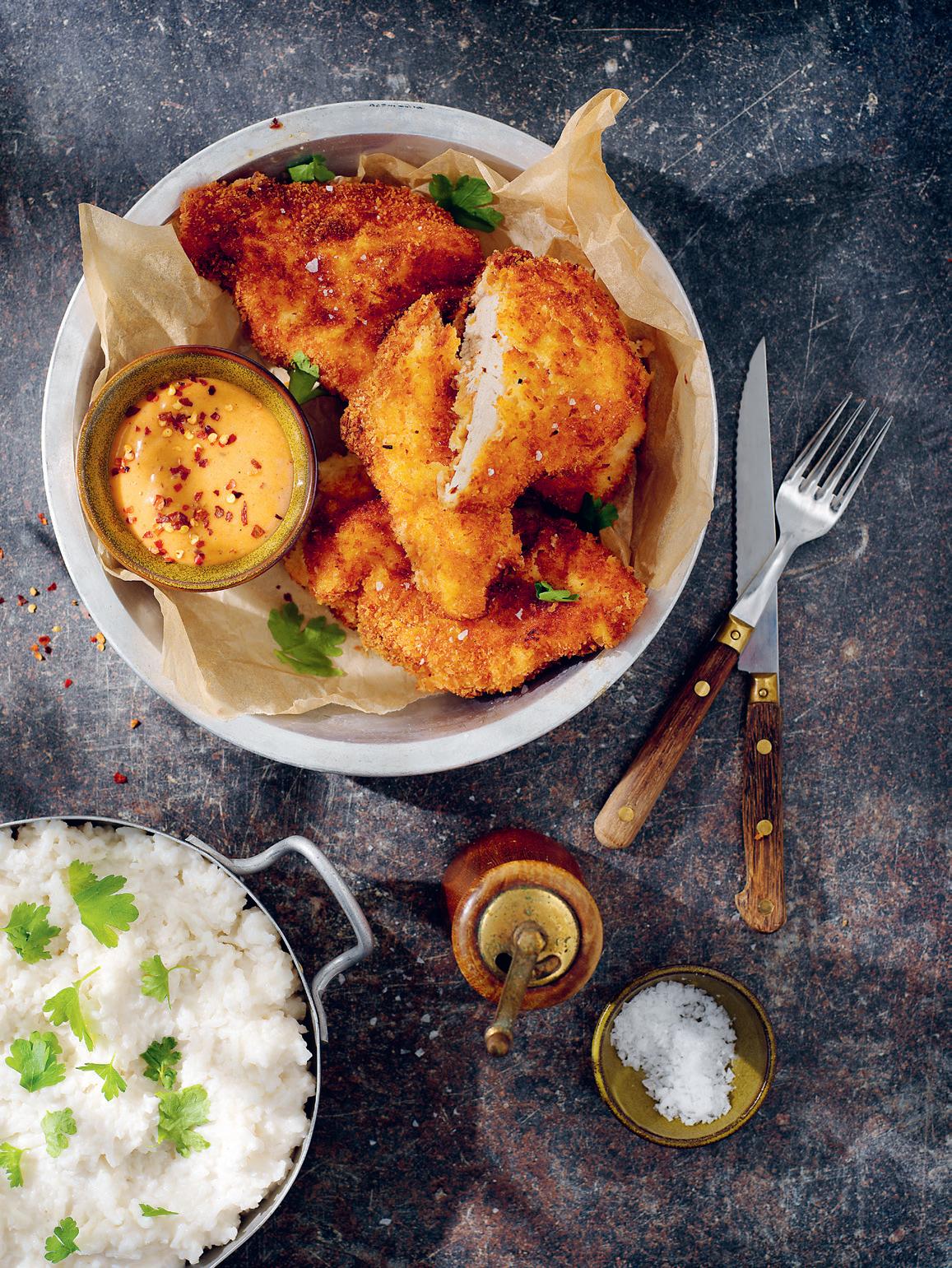 Den här panerade kycklingen är en av mina absoluta favoriträtter i boken. Jag älskar kokos, och här sätter det smak på både panering och ris. Underbart! Och gochujangmajon – vad ska jag säga? Den är bara så god.
